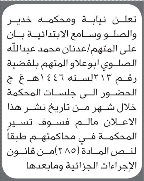 تعلن محكمة خدير والصلو وسامع بأن على المتهم عدنان الصلوي الحضور الى المحكمة إعلاناتمحاكم On نوفمبر 30, 2025 Share Share FacebookTwitterWhatsAppTelegramGoogle+البريد الإلكترونيPrint