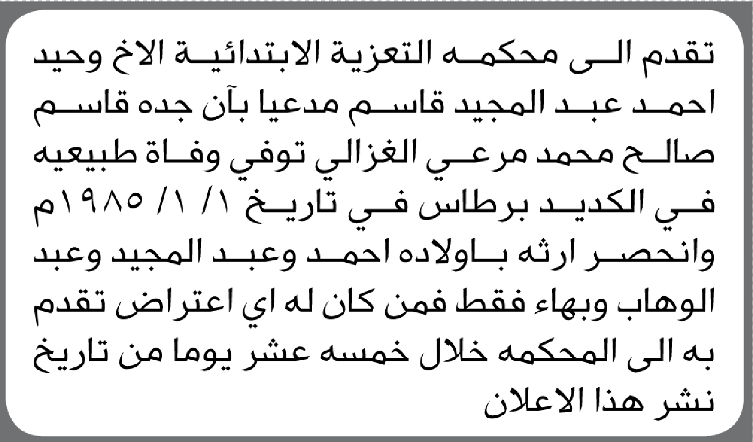 تقدم الى محكمة التعزية أن وحيد قاسم تقدم بطلب إنحصار وراثة إعلاناتمحاكم On ديسمبر 1, 2025 Share Share FacebookTwitterWhatsAppTelegramGoogle+البريد الإلكترونيPrint