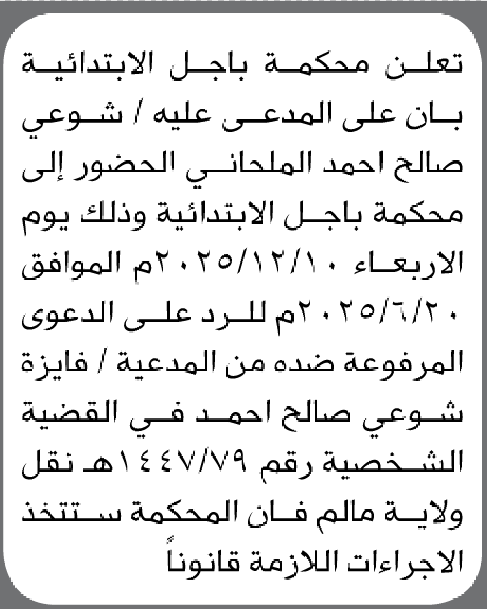 تعلن محكمة باجل بأن على المدعى عليه شوعي الملحاني الحضور الى المحكمة إعلاناتمحاكم On ديسمبر 1, 2025 Share Share FacebookTwitterWhatsAppTelegramGoogle+البريد الإلكترونيPrint