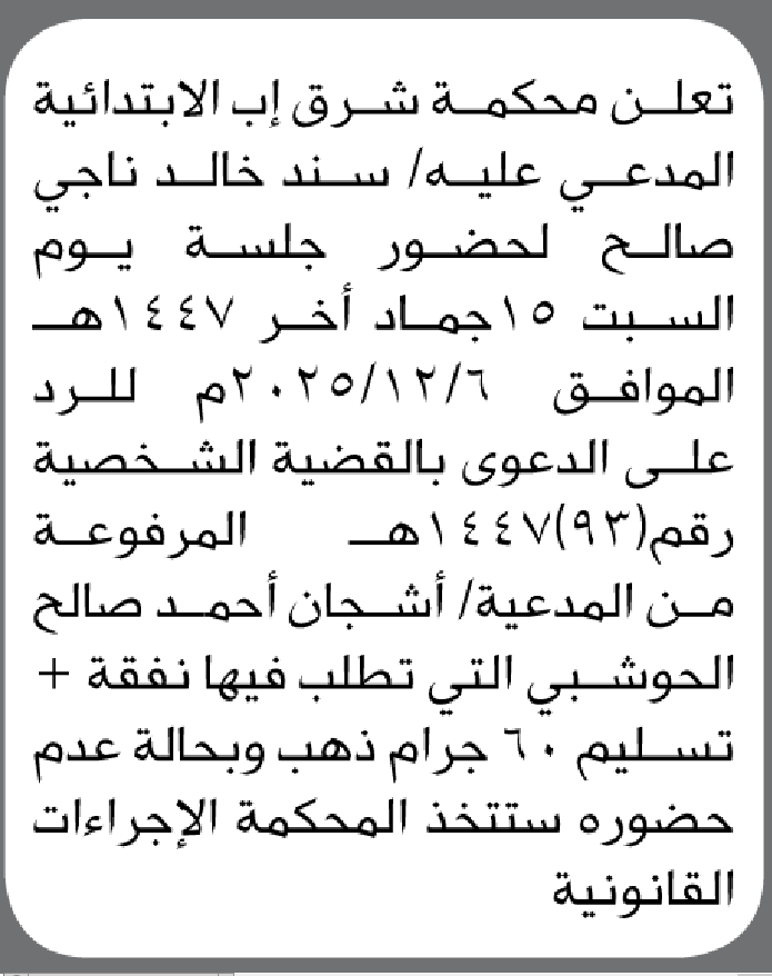 تعلن محكمة شرق إب أن على المدعى عليه سند صالح الحضور الى المحكمة إعلاناتمحاكم On ديسمبر 1, 2025 Share Share FacebookTwitterWhatsAppTelegramGoogle+البريد الإلكترونيPrint