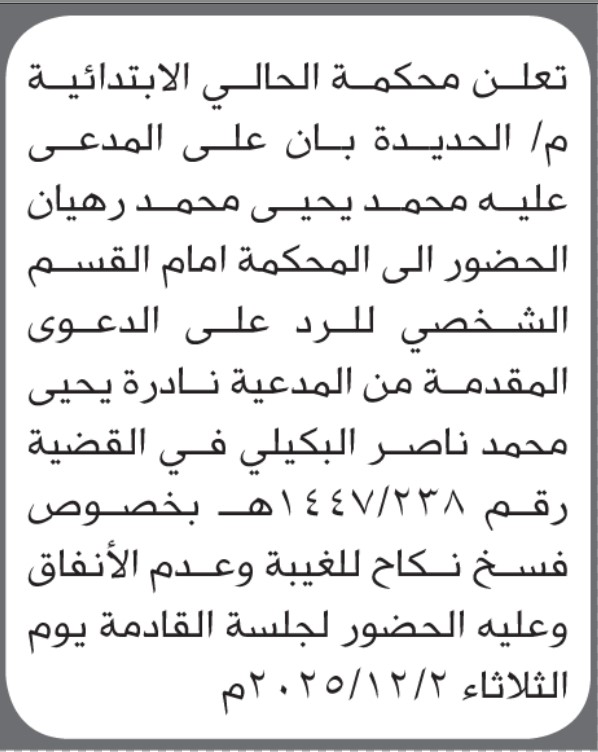 تعلن محكمة الحالي أن على المدعى عليه محمد رهيان الحضور إلى المحكمة إعلاناتمحاكم On نوفمبر 30, 2025 Share Share FacebookTwitterWhatsAppTelegramGoogle+البريد الإلكترونيPrint
