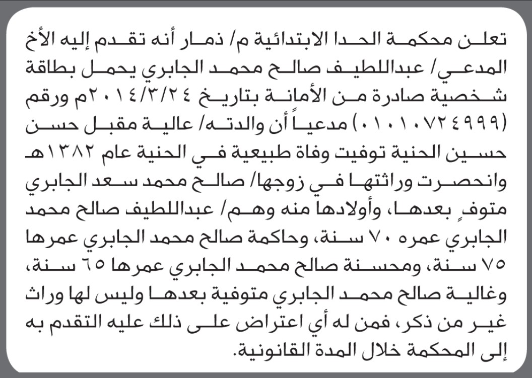 تعلن محكمة الحدا أن الأخ عبداللطيف صالح الجابري تقدم بدعوى انحصار وراثة إعلاناتمحاكم On نوفمبر 30, 2025 Share Share FacebookTwitterWhatsAppTelegramGoogle+البريد الإلكترونيPrint