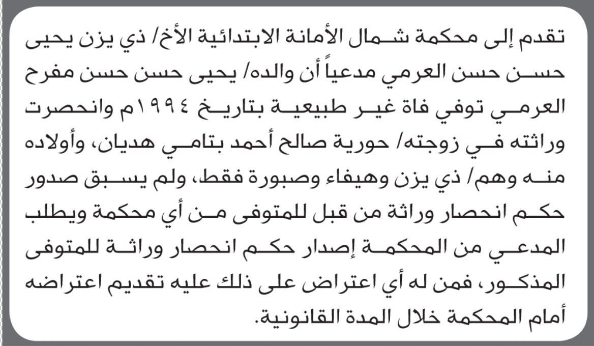 تعلن محكمة شمال الأمانة أن الأخ ذي يرن يحيى العرمي تقدم بدعوى انحصار وراثة إعلاناتمحاكم On نوفمبر 30, 2025 Share Share FacebookTwitterWhatsAppTelegramGoogle+البريد الإلكترونيPrint