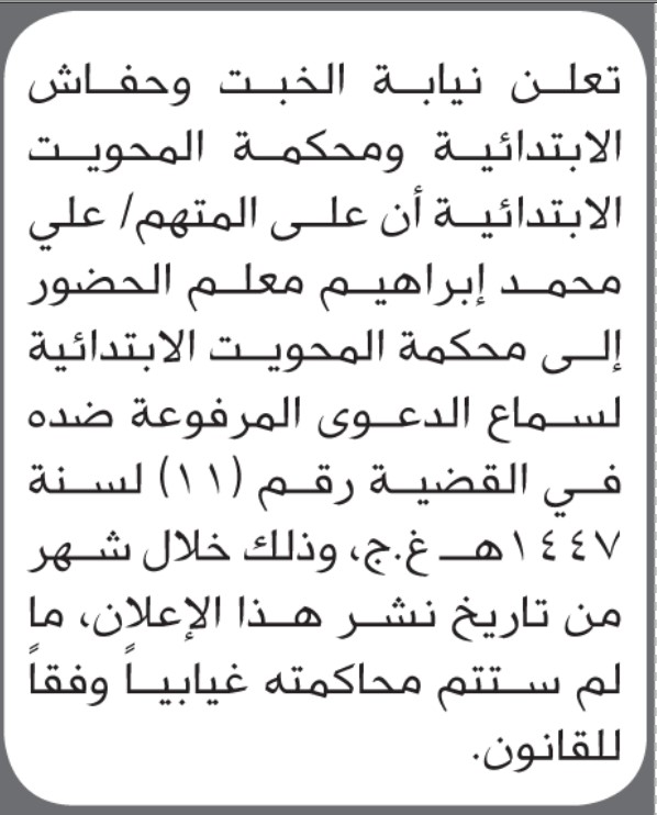 تعلن نيابة الخبت وحفاش للمتهم علي محمد معلم بالحضور إلى المحكمة إعلاناتمحاكم On نوفمبر 30, 2025 Share Share FacebookTwitterWhatsAppTelegramGoogle+البريد الإلكترونيPrint