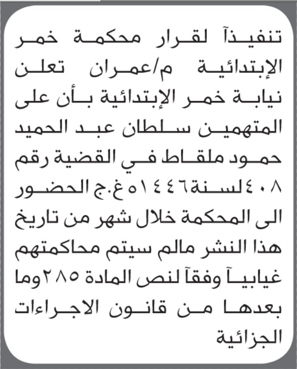 تعلن نيابة ومحكمة خمر للمتهم سلطان ملقاط بالحضور إلى المحكمة إعلاناتمحاكم On نوفمبر 30, 2025 Share Share FacebookTwitterWhatsAppTelegramGoogle+البريد الإلكترونيPrint
