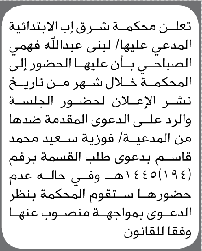 تعلن محكمة شرق إب الابتدائية بأن على/ لبنى عبدالله الصباحي الحضور إلى المحكمة إعلاناتمحاكم On ديسمبر 1, 2025 Share Share FacebookTwitterWhatsAppTelegramGoogle+البريد الإلكترونيPrint