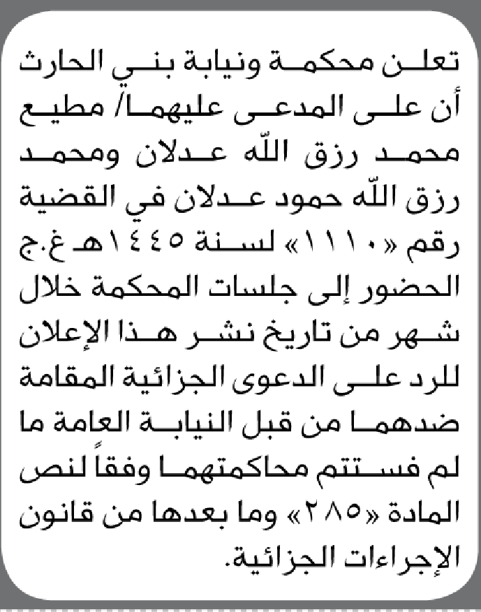 تعلن محكمة بني الحارث بأن على/ مطيع ومحمد عدلان الحضور إلى المحكمة إعلاناتمحاكم On ديسمبر 1, 2025 Share Share FacebookTwitterWhatsAppTelegramGoogle+البريد الإلكترونيPrint