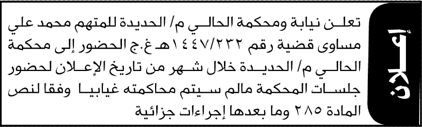تعلن نيابة ومحكمة الحالي للمتهم محمد علي مساوى بالحضور إلى المحكمة إعلاناتمحاكم On ديسمبر 1, 2025 Share Share FacebookTwitterWhatsAppTelegramGoogle+البريد الإلكترونيPrint