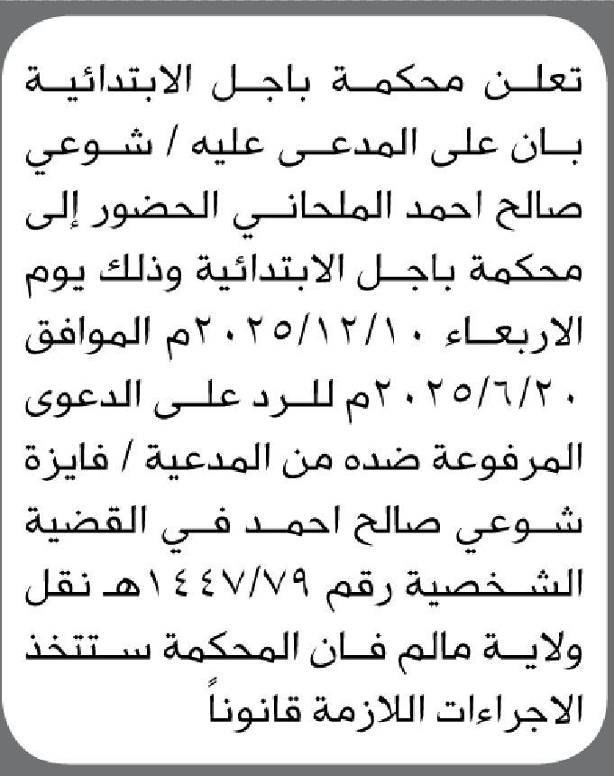 تعلن محكمة باجل بأن على المدعى عليه شوعي الملحاني الحضور الى المحكمة إعلاناتمحاكم On ديسمبر 2, 2025 Share Share FacebookTwitterWhatsAppTelegramGoogle+البريد الإلكترونيPrint