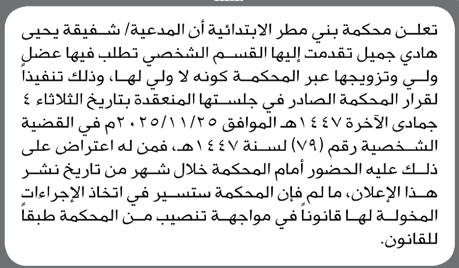 تعلن محكمة بني مطر أن المدعية شفيقة جميل تقدمت بطلب تزويجها إعلاناتمحاكم On ديسمبر 2, 2025 Share Share FacebookTwitterWhatsAppTelegramGoogle+البريد الإلكترونيPrint