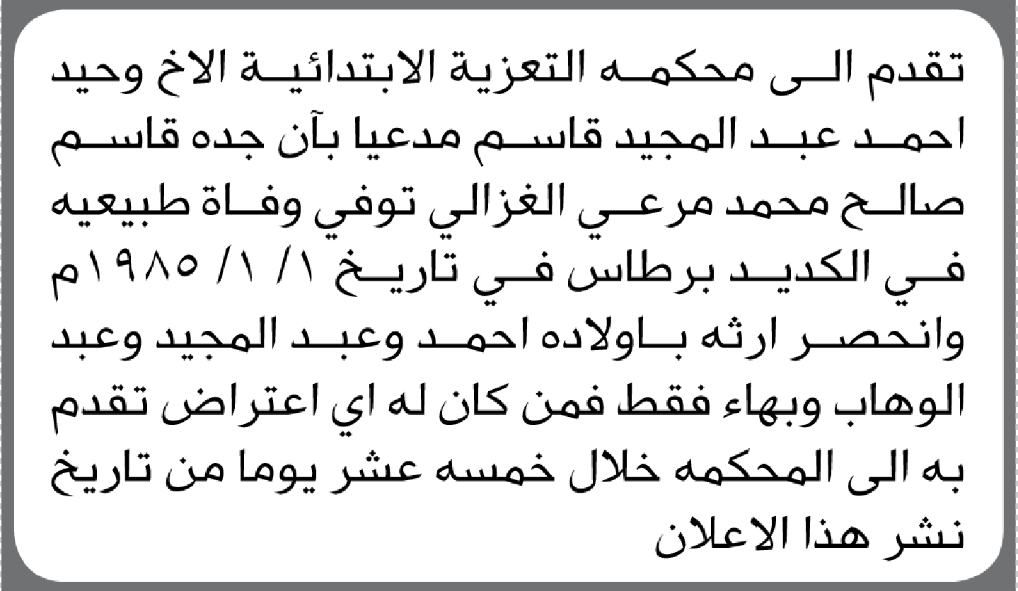 تعلن محكمة التعزية أن الأخ وحيد أحمد عبدالمجيد تقدم بدعوى انحصار وراثة إعلاناتمحاكم On ديسمبر 2, 2025 Share Share FacebookTwitterWhatsAppTelegramGoogle+البريد الإلكترونيPrint