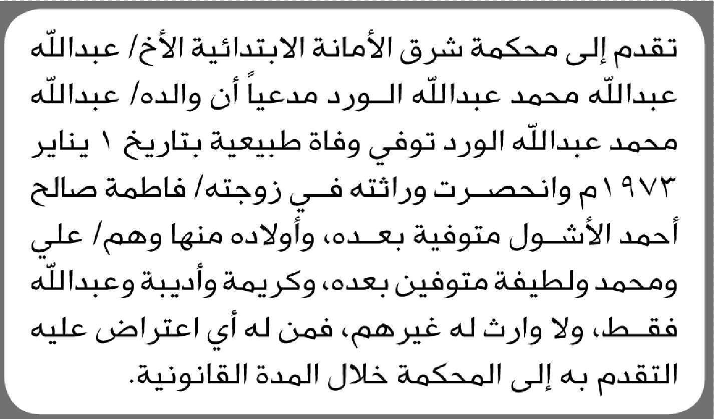 تعلن محكمة شرق الأمانة أن الأخ عبدالله عبدالله الورد تقدم بدعوى انحصار وراثة إعلاناتمحاكم On ديسمبر 2, 2025 Share Share FacebookTwitterWhatsAppTelegramGoogle+البريد الإلكترونيPrint