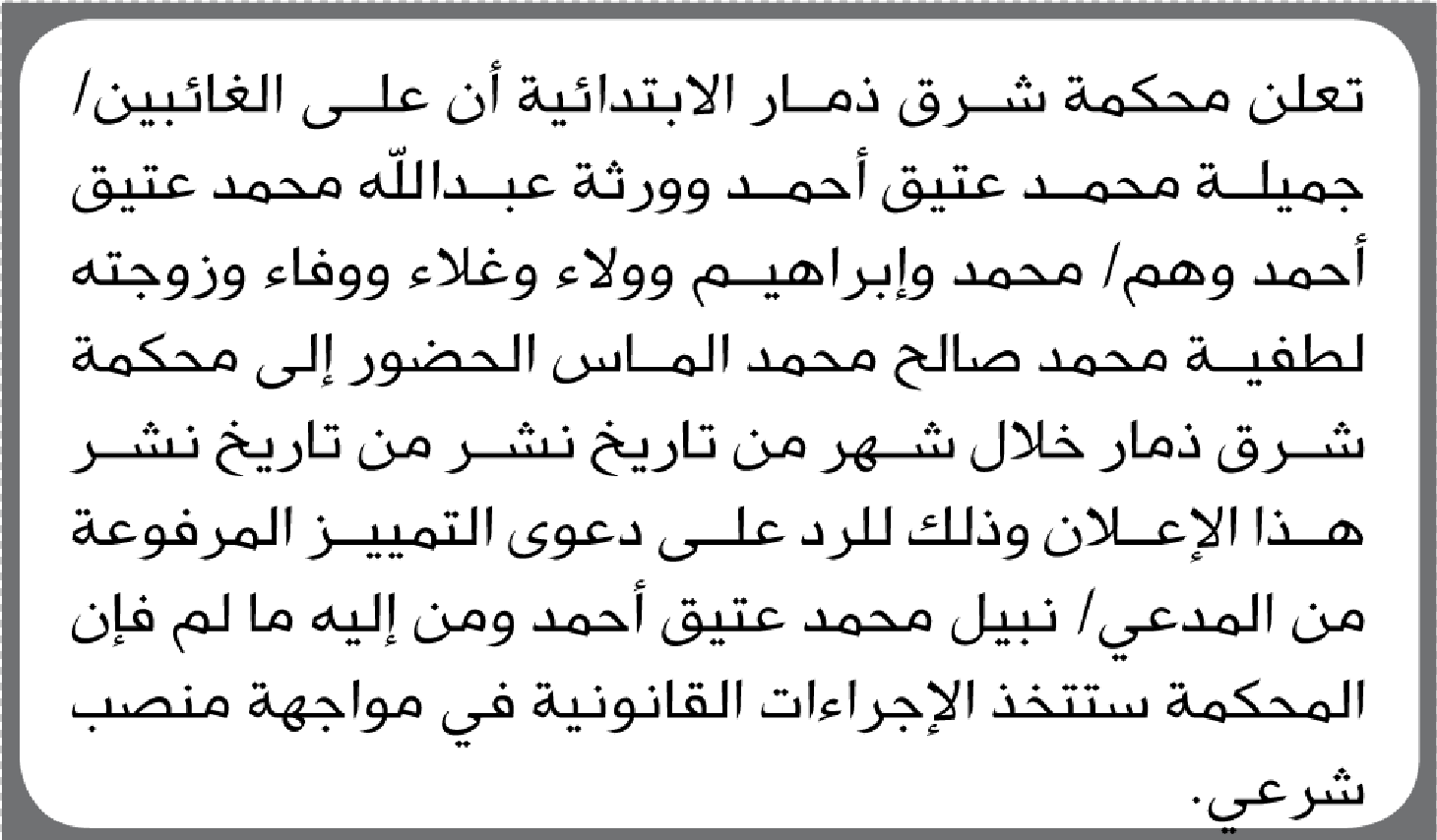 تعلن محكمة شرق ذمار الابتدائية بأن على/ جميلة أحمد وورثة عبدالله عتيق الحضور إلى المحكمة إعلاناتمحاكم On ديسمبر 2, 2025 Share Share FacebookTwitterWhatsAppTelegramGoogle+البريد الإلكترونيPrint