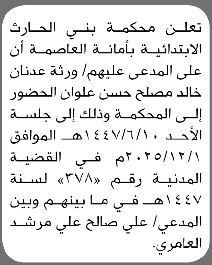 تعلن محكمة بني الحارث بأن على ورثة/ عدنان خالد علوان الحضور إلى المحكمة إعلاناتمحاكم On ديسمبر 2, 2025 Share Share FacebookTwitterWhatsAppTelegramGoogle+البريد الإلكترونيPrint