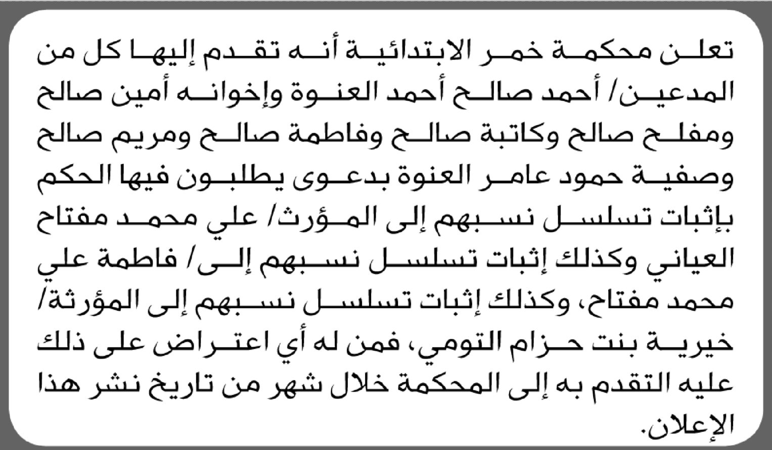 تعلن محكمة خمر أنه تقدم اليها أحمد العنوة وإخوانه بطلب إثبات تسلسل نسبهم إعلاناتمحاكم On ديسمبر 3, 2025 Share Share FacebookTwitterWhatsAppTelegramGoogle+البريد الإلكترونيPrint