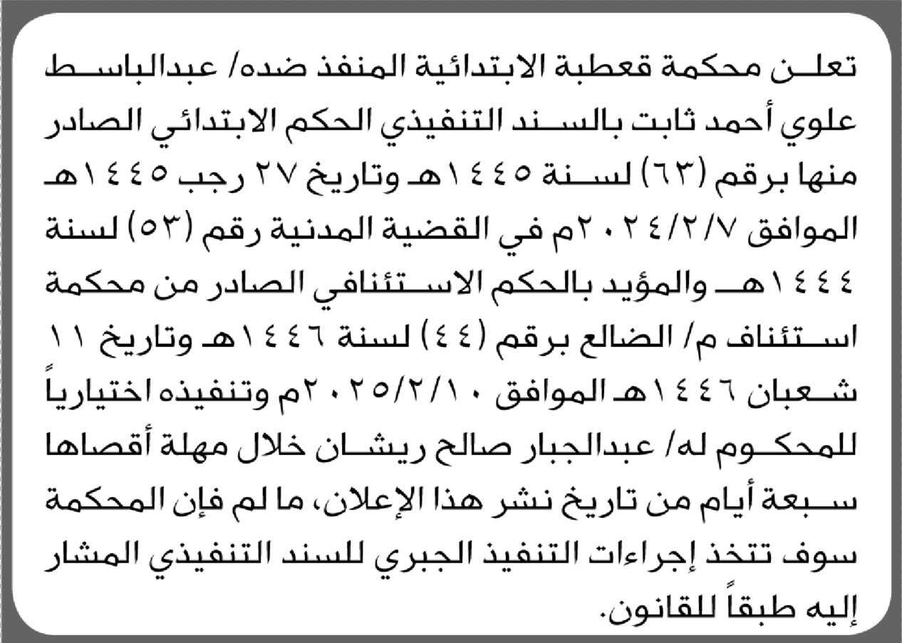 تعلن محكمة قعطبة أن على عبدالباسط ثابت تنفيذ الحكم إعلاناتمحاكم On ديسمبر 3, 2025 Share Share FacebookTwitterWhatsAppTelegramGoogle+البريد الإلكترونيPrint