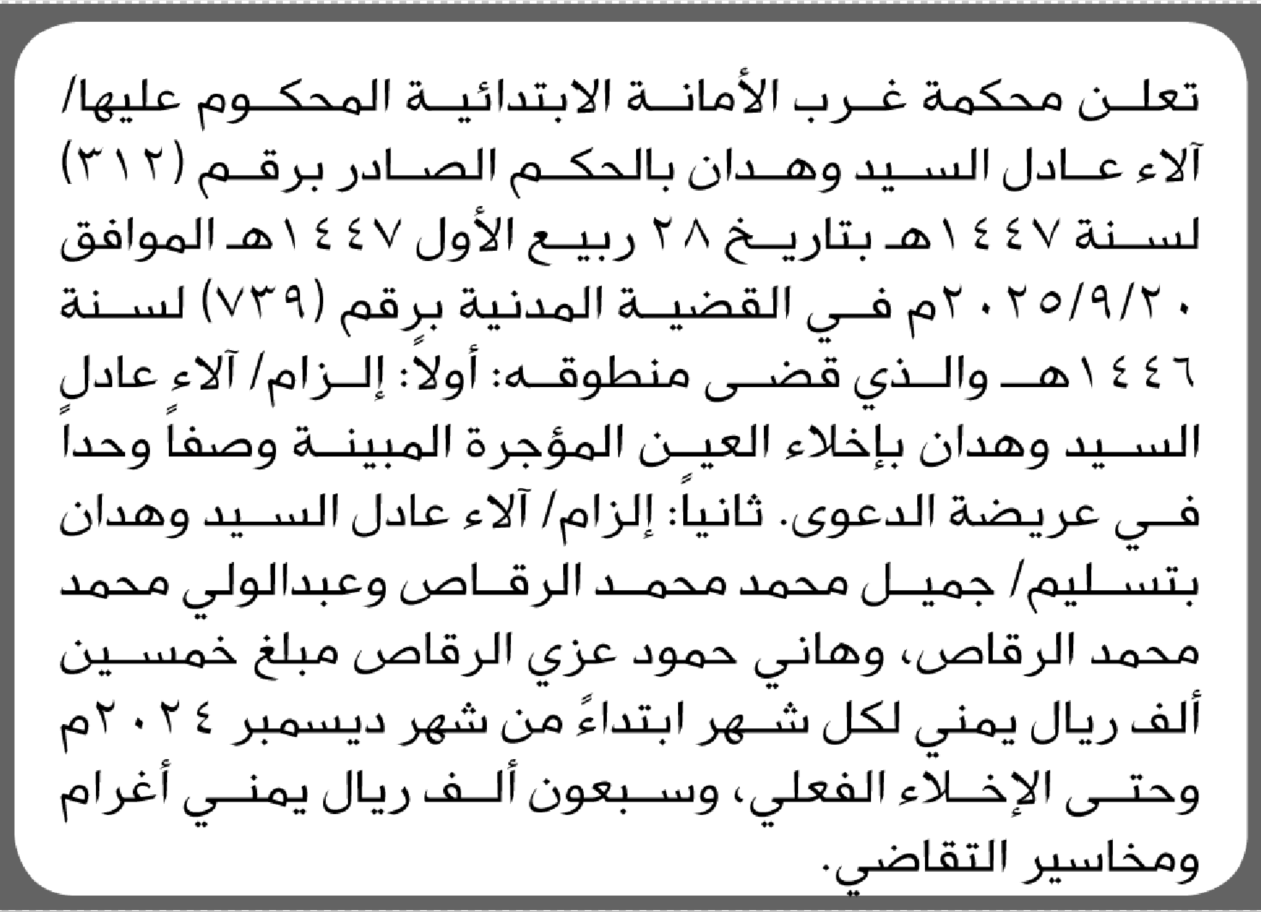 تعلن محكمة غرب الأمانة بأن على/ آلاء عادل وهدان تنفيذ منطوق الحكم إعلاناتمحاكم On ديسمبر 3, 2025 Share Share FacebookTwitterWhatsAppTelegramGoogle+البريد الإلكترونيPrint