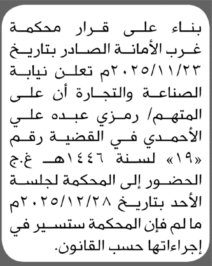 تعلن محكمة غرب الأمانة بأن على/ رمزي عبده الأحمدي الحضور إلى المحكمة إعلاناتمحاكم On ديسمبر 3, 2025 Share Share FacebookTwitterWhatsAppTelegramGoogle+البريد الإلكترونيPrint