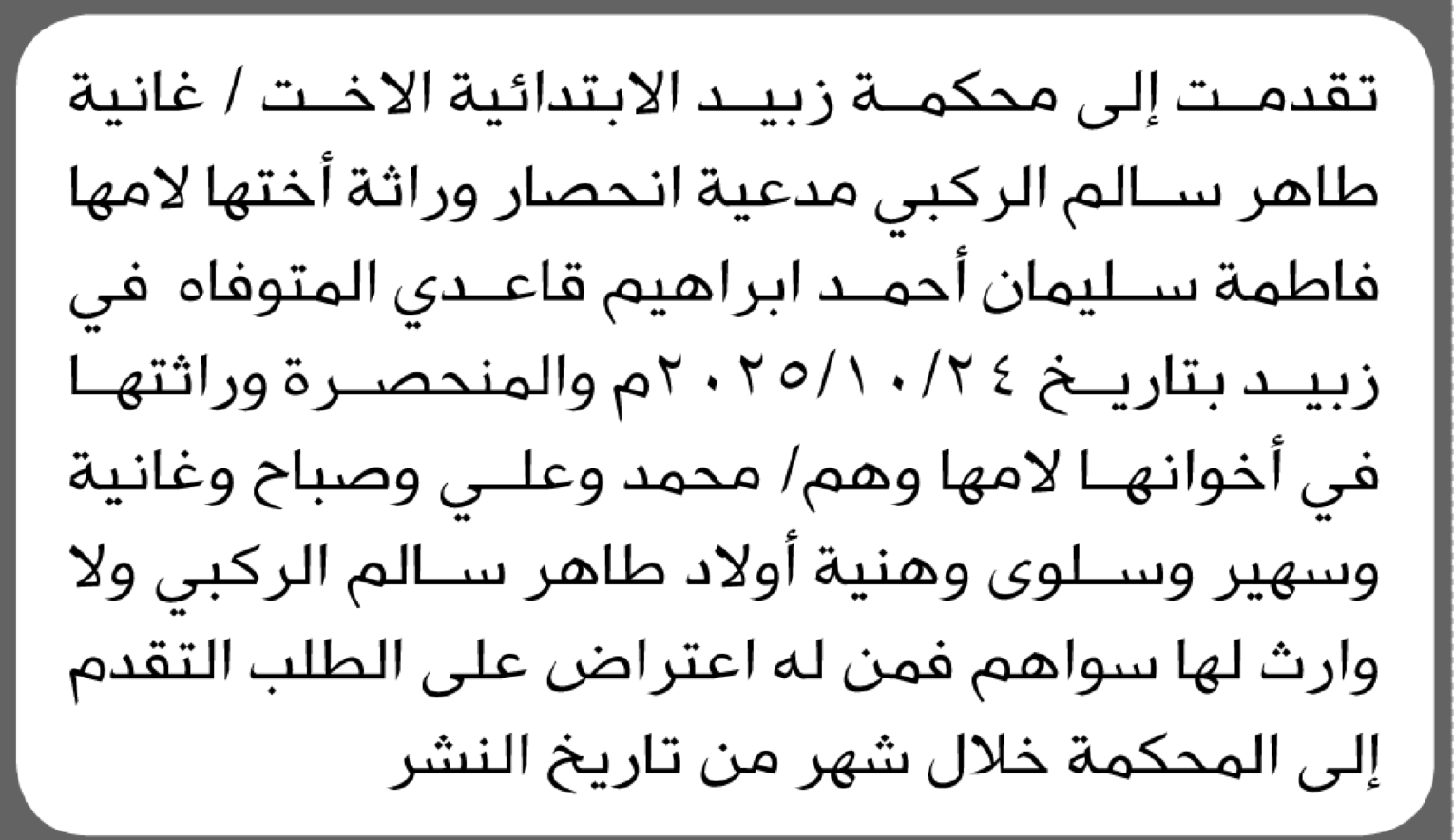تعلن محكمة زبيد أن الأخت غانية طاهر الركبي تقدمت بدعوى انحصار وراثة إعلاناتمحاكم On ديسمبر 3, 2025 Share Share FacebookTwitterWhatsAppTelegramGoogle+البريد الإلكترونيPrint