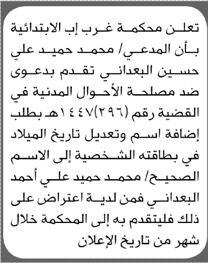 تعلن محكمة غرب إب أن الأخ محمد حميد البعداني تقدم بطلب تصحيح اسمه إعلاناتمحاكم On ديسمبر 3, 2025 Share Share FacebookTwitterWhatsAppTelegramGoogle+البريد الإلكترونيPrint