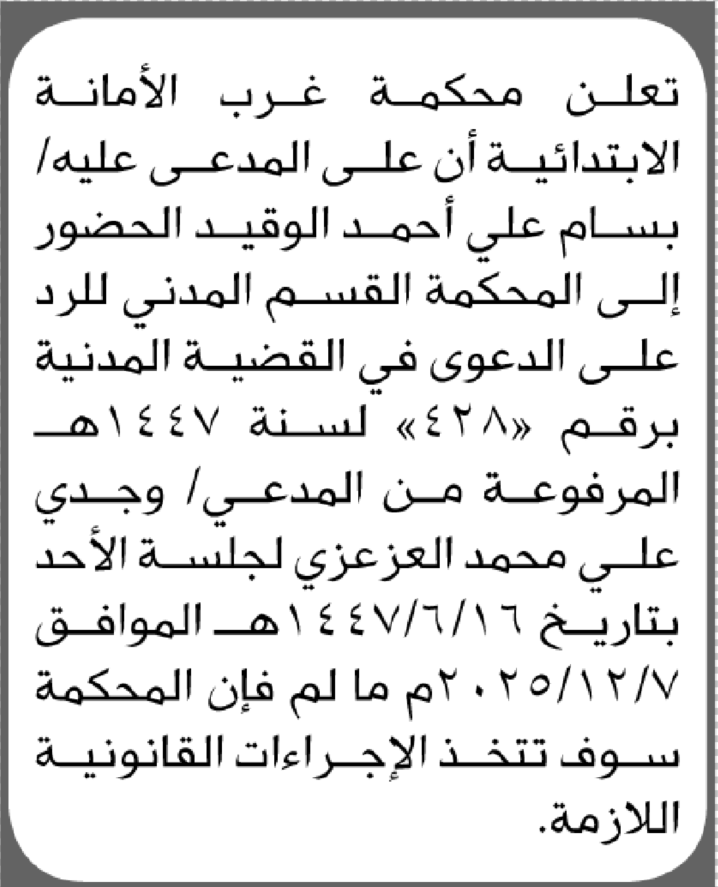 تعلن محكمة غرب الأمانة أن على المدعى عليه بسام علي الوقيد الحضور إلى المحكمة إعلاناتمحاكم On ديسمبر 3, 2025 Share Share FacebookTwitterWhatsAppTelegramGoogle+البريد الإلكترونيPrint