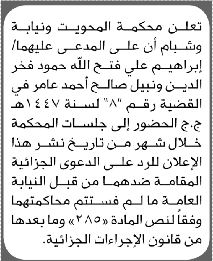 تعلن محكمة المحويت الابتدائية بأن على/ إبراهيم فخرالدين ونبيل عامر الحضور إلى المحكمة إعلاناتمحاكم On ديسمبر 3, 2025 Share Share FacebookTwitterWhatsAppTelegramGoogle+البريد الإلكترونيPrint