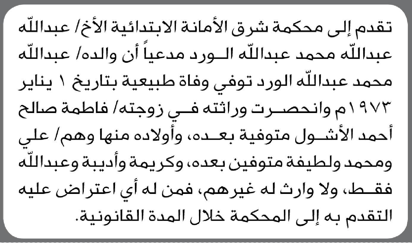 تعلن محكمة شرق الأمانة بأن الأخ/ عبدالله محمد الورد تقدم إليها بطلب انحصار وراثة إعلاناتمحاكم On ديسمبر 4, 2025 Share Share FacebookTwitterWhatsAppTelegramGoogle+البريد الإلكترونيPrint