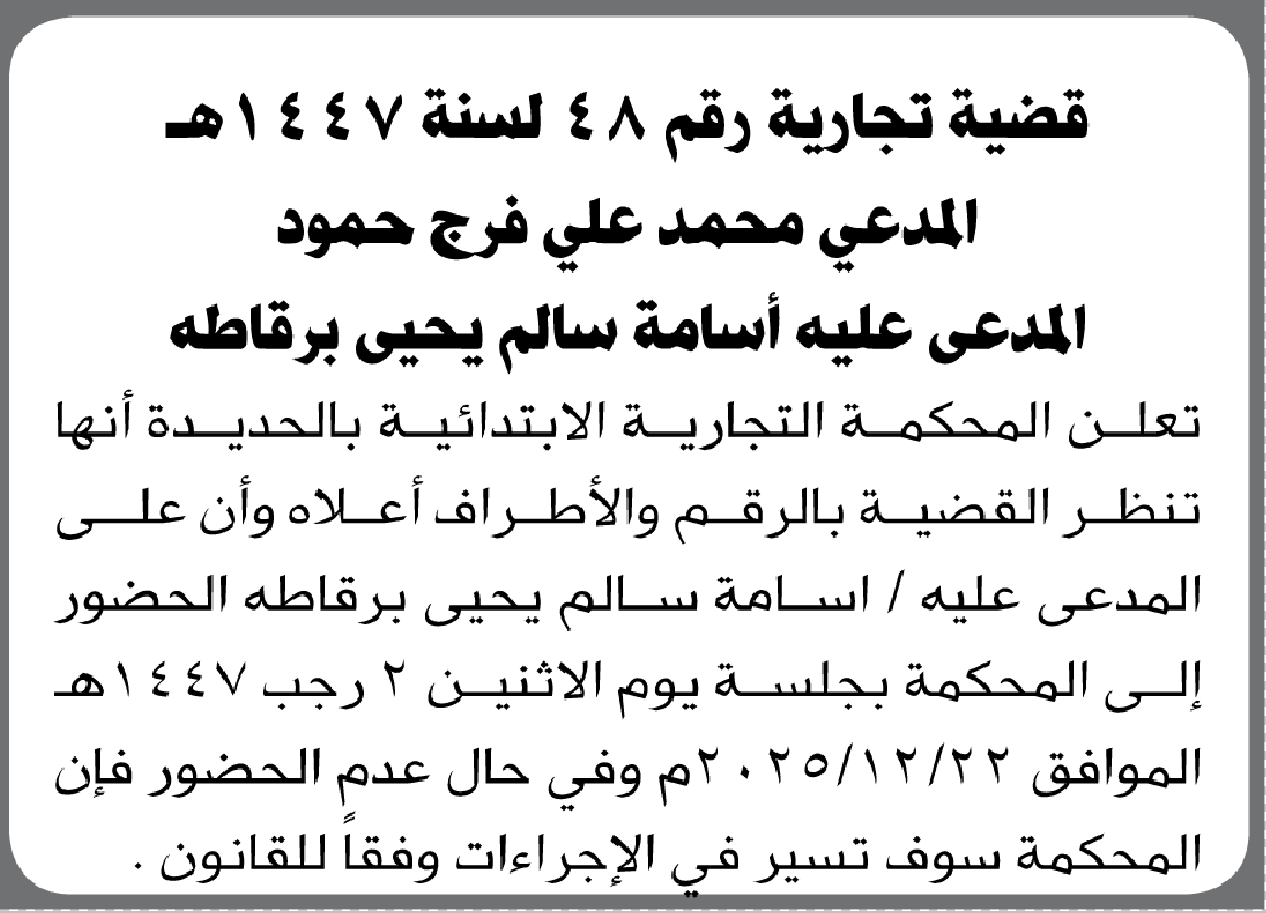 تعلن المحكمة التجارية الابتدائية بأن على/ أسامة سالم برقطه الحضور إلى المحكمة إعلاناتمحاكم On ديسمبر 4, 2025 Share Share FacebookTwitterWhatsAppTelegramGoogle+البريد الإلكترونيPrint