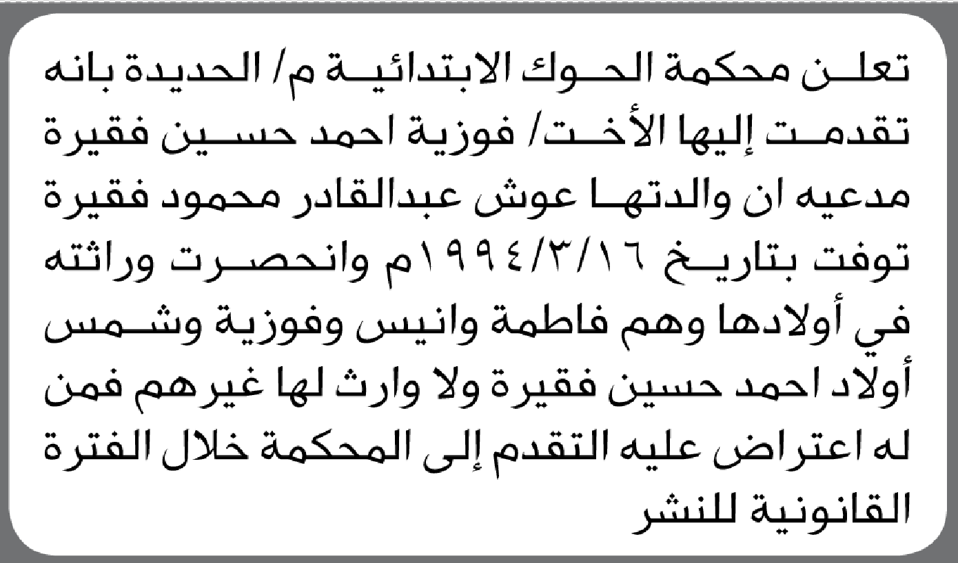 تعلن محكمة الحوك أن الأخت فوزية أحمد فقيرة تقدم بدعوى انحصار وراثة إعلاناتمحاكم On ديسمبر 4, 2025 Share Share FacebookTwitterWhatsAppTelegramGoogle+البريد الإلكترونيPrint