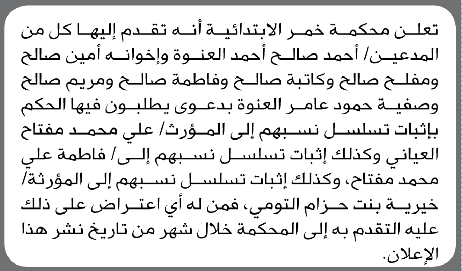 تعلن محكمة خمر أن الأخوة أحمد صالح العنوة وإخوانه تقدموا بطلب اثبات تسلسل نسب إعلاناتمحاكم On ديسمبر 4, 2025 Share Share FacebookTwitterWhatsAppTelegramGoogle+البريد الإلكترونيPrint