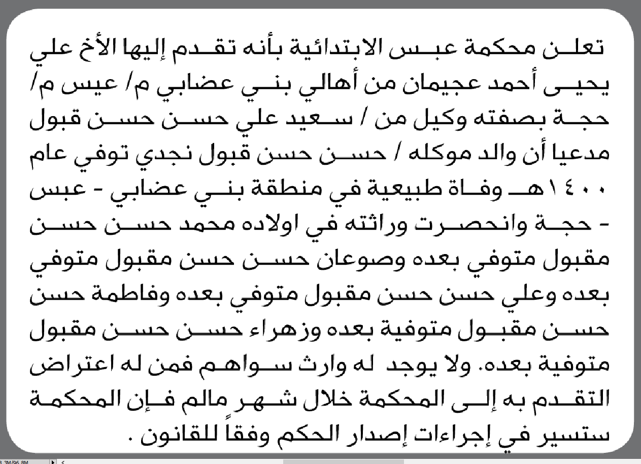 تعلن محكمة عبس أن الأخ علي يحيى عجيمان تقدم بدعوى انحصار وراثة إعلاناتمحاكم On ديسمبر 4, 2025 Share Share FacebookTwitterWhatsAppTelegramGoogle+البريد الإلكترونيPrint