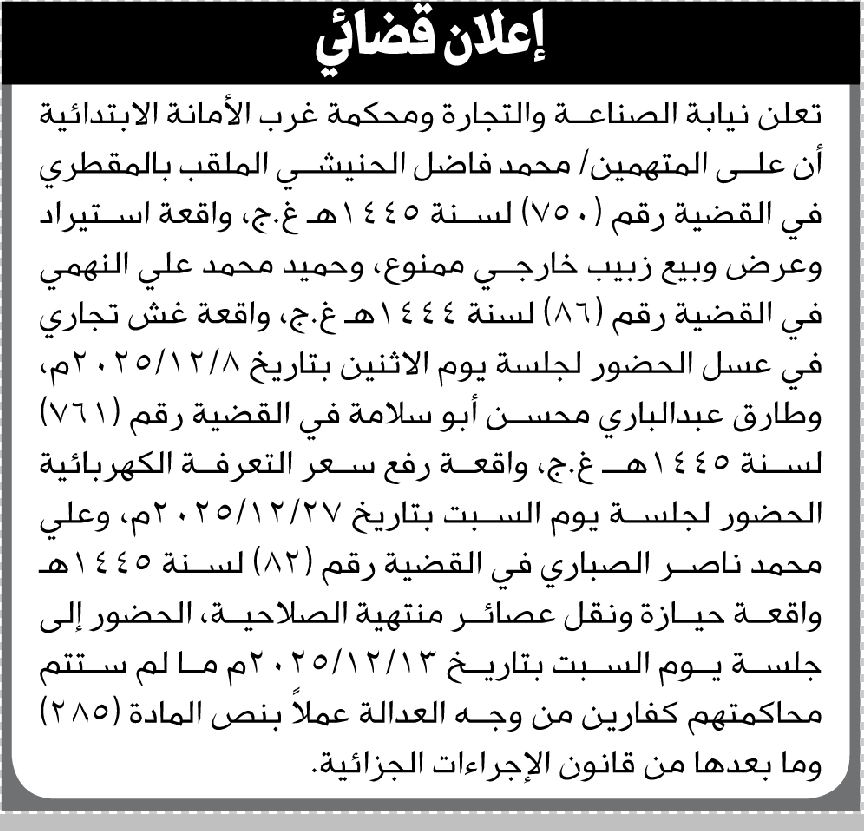 تعلن نيابة الصناعة ومحكمة غرب الأمانة أن على المتهمين محمد الحنيشي وآخرين الحضور إلى المحكمة إعلاناتمحاكم On ديسمبر 4, 2025 Share Share FacebookTwitterWhatsAppTelegramGoogle+البريد الإلكترونيPrint
