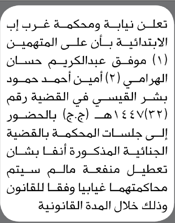 تعلن نيابة ومحكمة غرب إب أن على المتهمين موفق الهرامي و أمين القيسي الحضور إلى المحكمة إعلاناتمحاكم On ديسمبر 4, 2025 Share Share FacebookTwitterWhatsAppTelegramGoogle+البريد الإلكترونيPrint