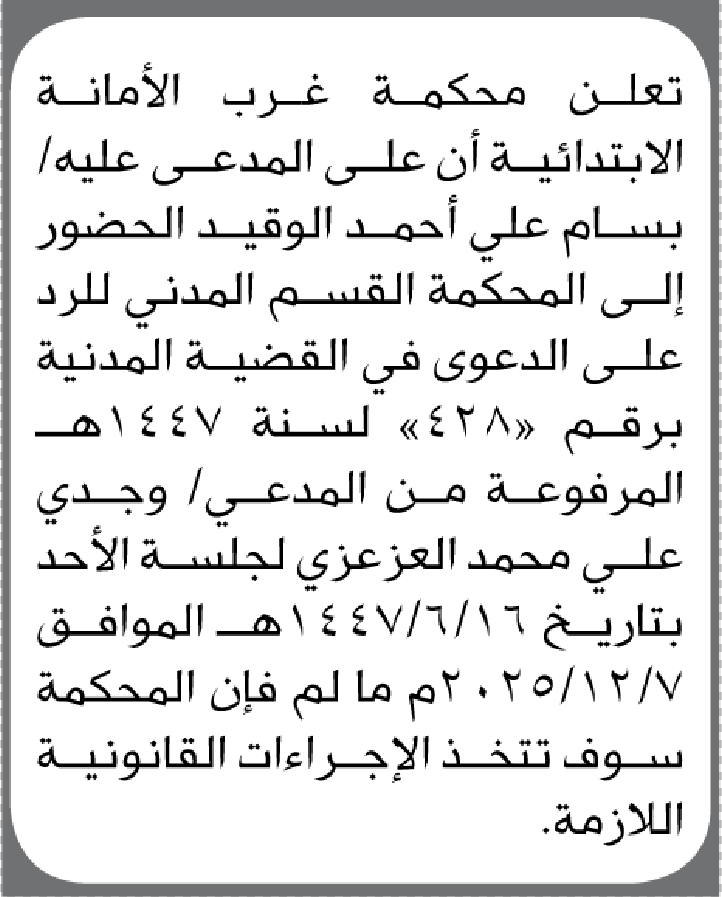 تعلن محكمة غرب الأمانة أن على المدعى عليه بسام الوقيد الحضور الى المحكمة إعلاناتمحاكم On ديسمبر 4, 2025 Share Share FacebookTwitterWhatsAppTelegramGoogle+البريد الإلكترونيPrint