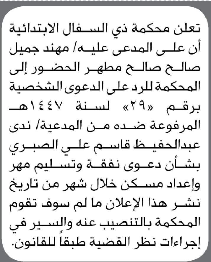 تعلن محكمة ذي السفال أن على المدعى عليه مهند مطهر الحضور الى المحكمة إعلاناتمحاكم On ديسمبر 4, 2025 Share Share FacebookTwitterWhatsAppTelegramGoogle+البريد الإلكترونيPrint