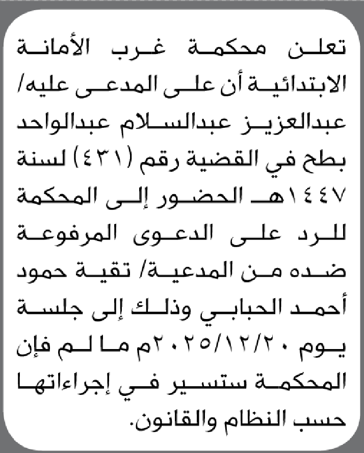 تعلن محكمة غرب الأمانة أن على المدعى عليه عبدالعزيز بطح الحضور الى المحكمة إعلاناتمحاكم On ديسمبر 4, 2025 Share Share FacebookTwitterWhatsAppTelegramGoogle+البريد الإلكترونيPrint