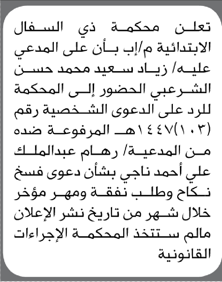 تعلن محكمة ذي السفال أن على المدعى عليه زياد الشرعبي الحضور الى المحكمة إعلاناتمحاكم On ديسمبر 4, 2025 Share Share FacebookTwitterWhatsAppTelegramGoogle+البريد الإلكترونيPrint