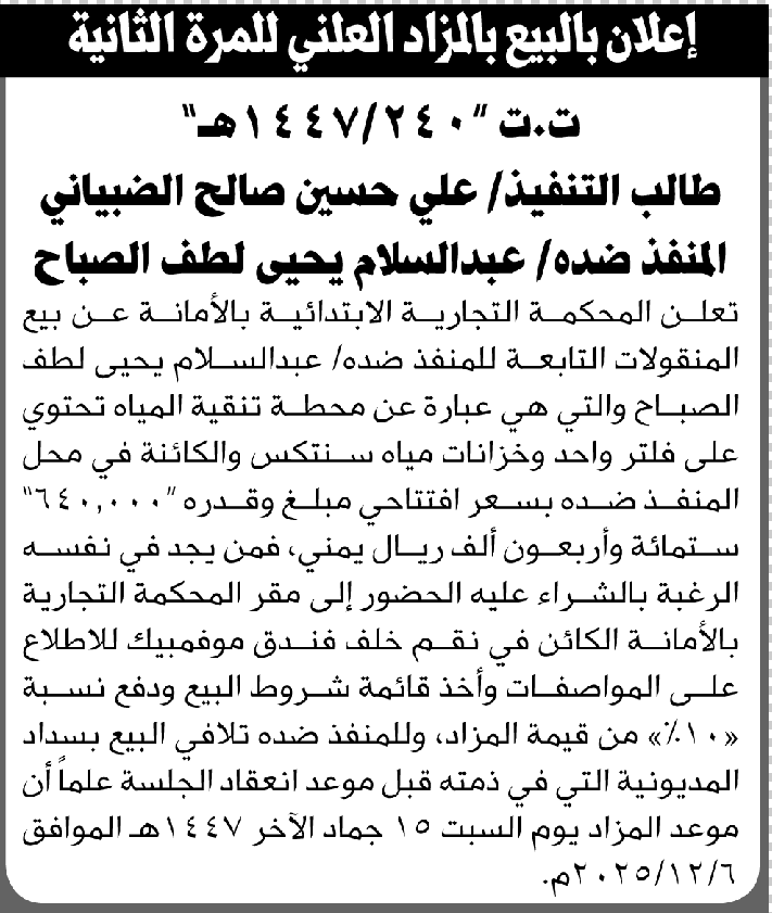 تعلن المحكمة التجارية الابتدائية عن بيع بالمزاد العلني لمنقولات المنفذ ضده/ عبدالسلام يحيى الصباح إعلاناتمناقصات On ديسمبر 5, 2025 Share Share FacebookTwitterWhatsAppTelegramGoogle+البريد الإلكترونيPrint