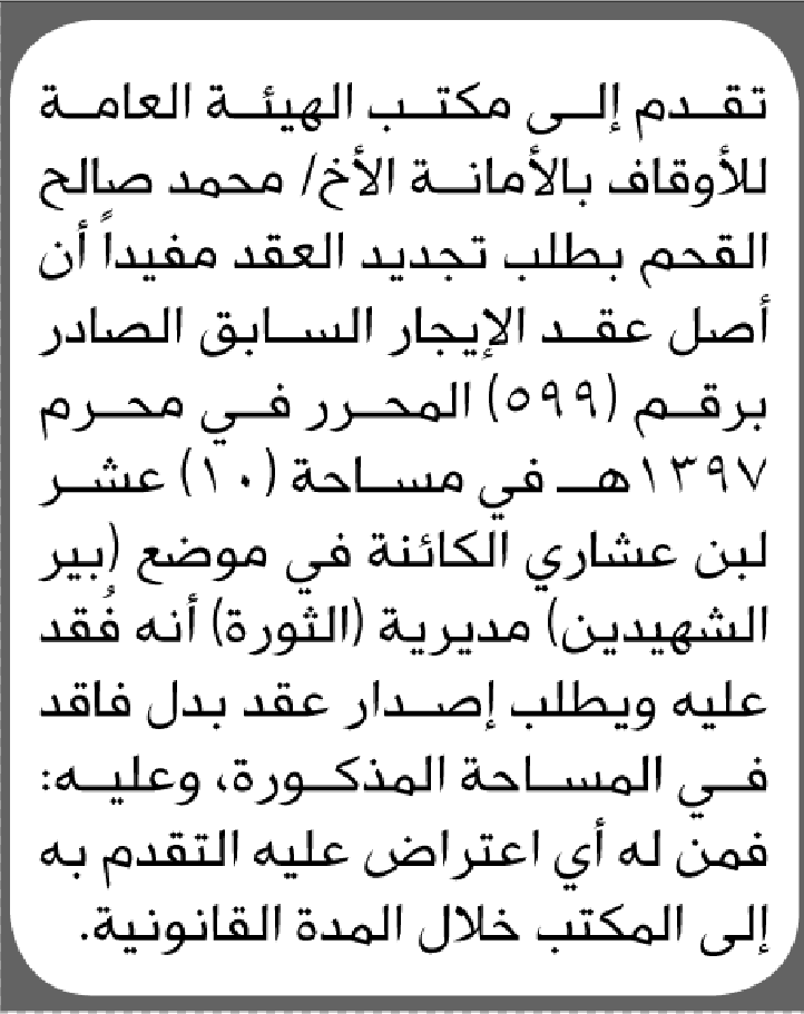 تعلن الهيئة العامة للأوقاف بالأمانة بأن الأخ/ محمد صالح القحم تقدم إليها بطلب تجديد عقد الإيجار إعلاناتمحاكم On ديسمبر 5, 2025 Share Share FacebookTwitterWhatsAppTelegramGoogle+البريد الإلكترونيPrint