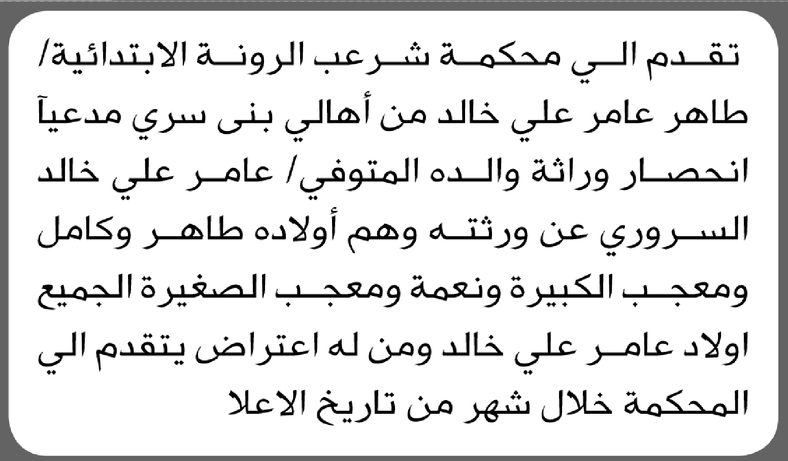 تعلن محكمة شرعب الرونة الابتدائية بأن الأخ/ طاهر عامر خالد تقدم إليها بطلب انحصار وراثة إعلاناتمحاكم On ديسمبر 5, 2025 Share Share FacebookTwitterWhatsAppTelegramGoogle+البريد الإلكترونيPrint