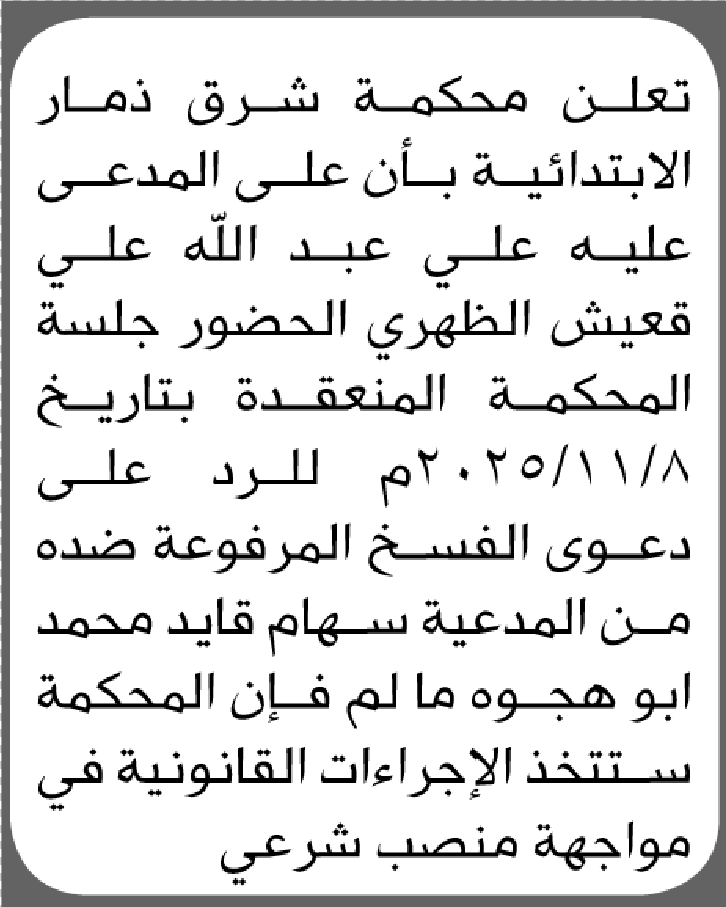 تعلن محكمة شرق ذمار بأن على المدعى عليه علي الظهري الحضور الى المحكمة إعلاناتمحاكم On ديسمبر 5, 2025 Share Share FacebookTwitterWhatsAppTelegramGoogle+البريد الإلكترونيPrint