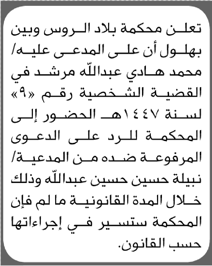 تعلن محكمة بلاد الروس وبني بهلول أن على المدعى عليه محمد مرشد الحضور الى المحكمة إعلاناتمحاكم On ديسمبر 5, 2025 Share Share FacebookTwitterWhatsAppTelegramGoogle+البريد الإلكترونيPrint