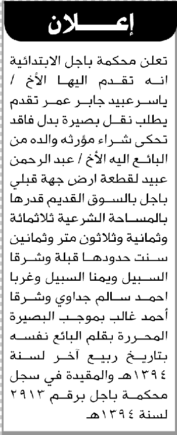 تعلن محكمة باجل أن الأخ ياسر عبيد جابر تقدم بطلب نقل بصيرة بدل فاقد إعلاناتمحاكم On ديسمبر 5, 2025 Share Share FacebookTwitterWhatsAppTelegramGoogle+البريد الإلكترونيPrint
