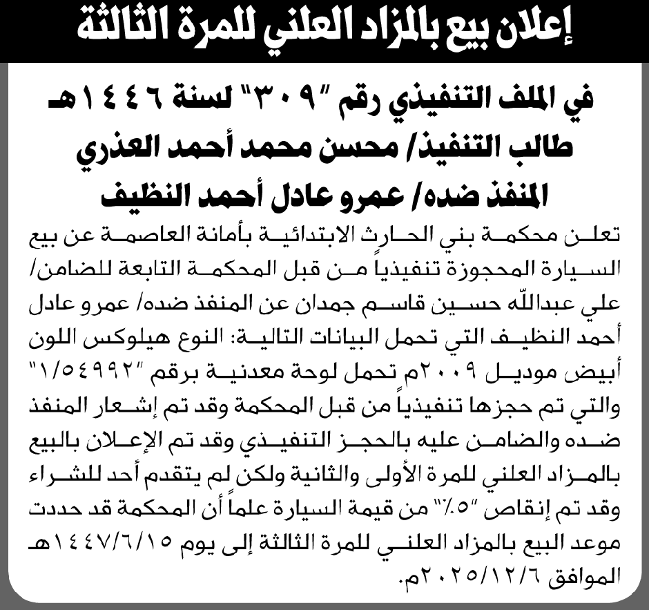 تعلن محكمة بني الحارث عن بيع السيارة التابعة للمنفذ ضده عمرو النظيف إعلاناتمحاكم On ديسمبر 5, 2025 Share Share FacebookTwitterWhatsAppTelegramGoogle+البريد الإلكترونيPrint