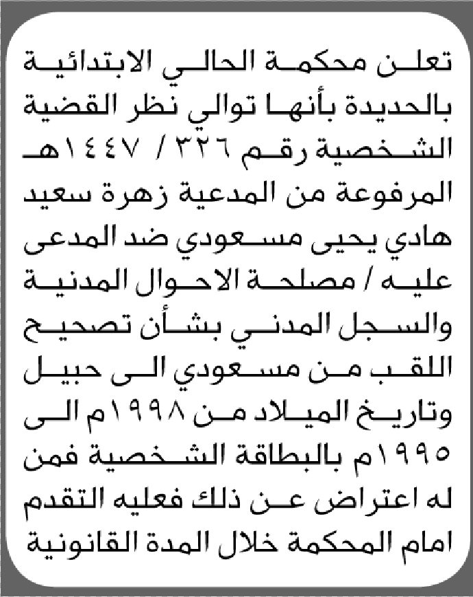 تعلن محكمة الحالي أن الأخت زهرة سعيد مسعودي تقدمت بطلب تصحيح اسمها إعلاناتمحاكم On ديسمبر 6, 2025 Share Share FacebookTwitterWhatsAppTelegramGoogle+البريد الإلكترونيPrint