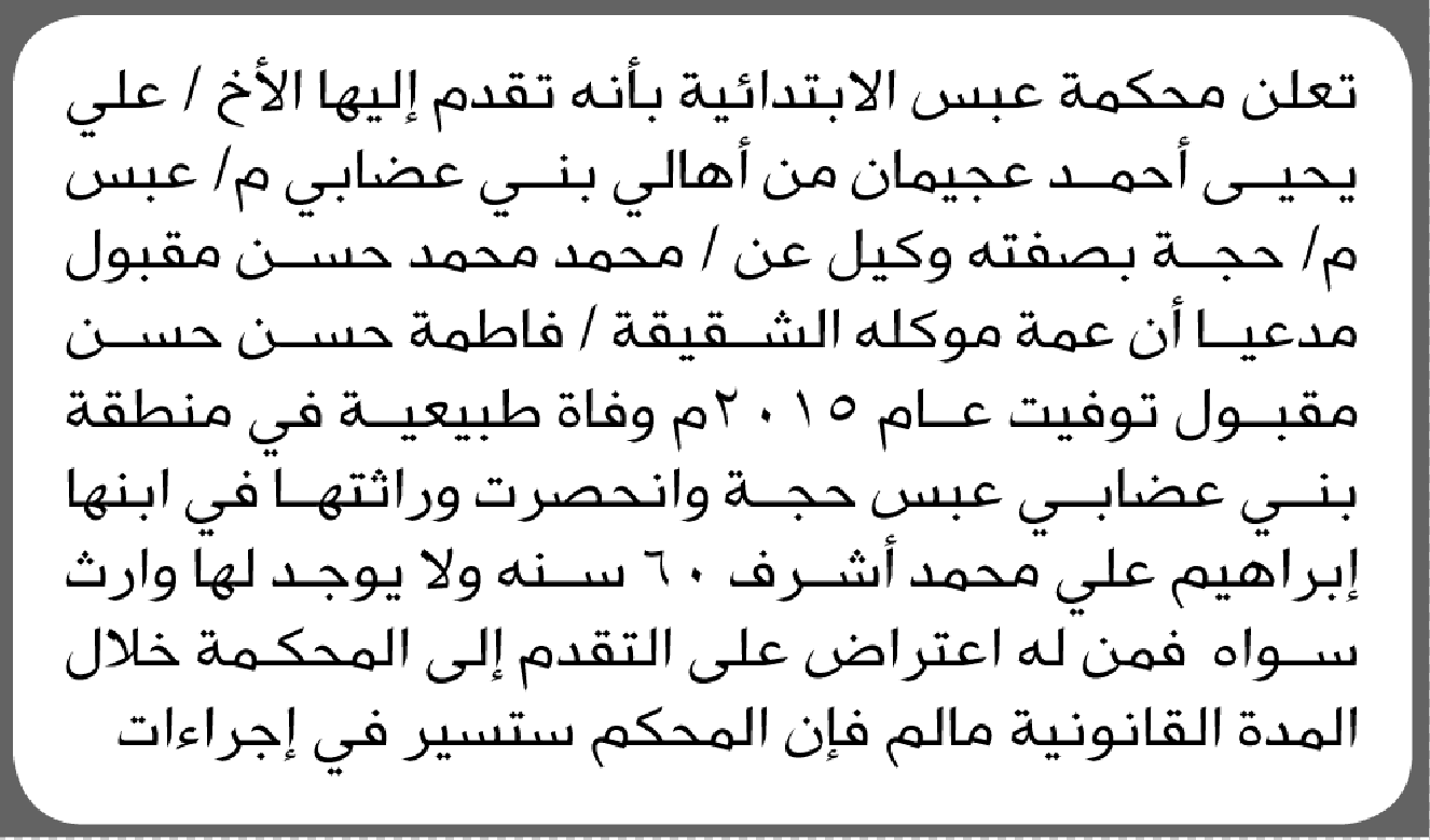 تعلن محكمة عبس أن الأخ محمد محمد مقبول تقدم بدعوى انحصار وراثة إعلاناتمحاكم On ديسمبر 6, 2025 Share Share FacebookTwitterWhatsAppTelegramGoogle+البريد الإلكترونيPrint