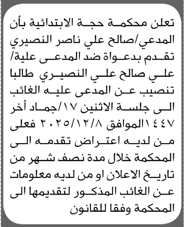 تعلبن محكمة حجة الابتدائية بأن الأخ/ صالح النصيري تقدم إليها بطلب تنصيب عن علي النصيري إعلاناتمحاكم On ديسمبر 6, 2025 Share Share FacebookTwitterWhatsAppTelegramGoogle+البريد الإلكترونيPrint