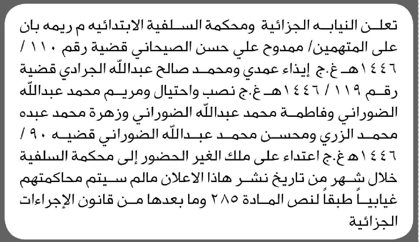 تعلن محكمة السفلية الابتدائية بأن على/ ممدوح علي الصيحاني الحضور إلى المحكمة إعلاناتمحاكم On ديسمبر 6, 2025 Share Share FacebookTwitterWhatsAppTelegramGoogle+البريد الإلكترونيPrint