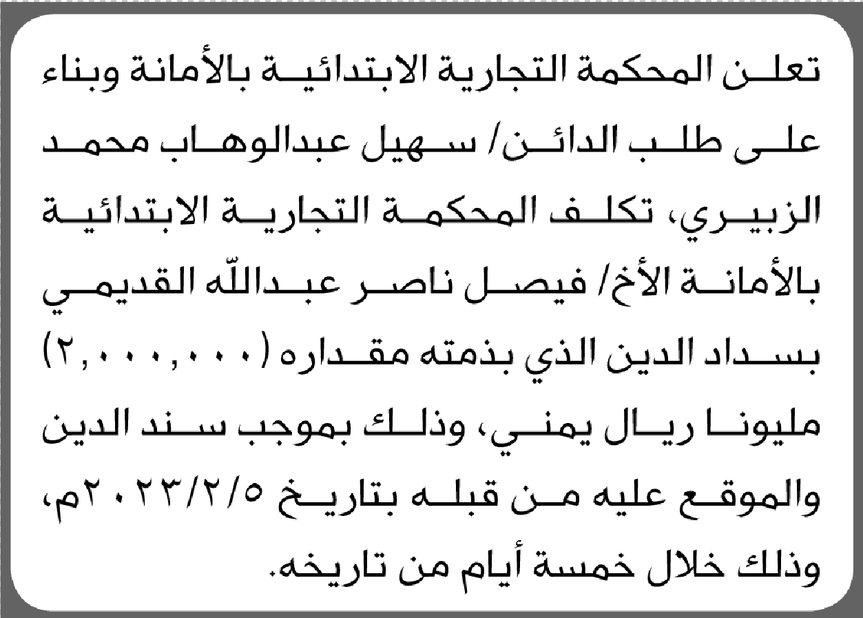 تعلن المحكمة التجارية بالأمانة أن على فيصل القديمي سداد الدين إعلاناتمحاكم On ديسمبر 7, 2025 Share Share FacebookTwitterWhatsAppTelegramGoogle+البريد الإلكترونيPrint