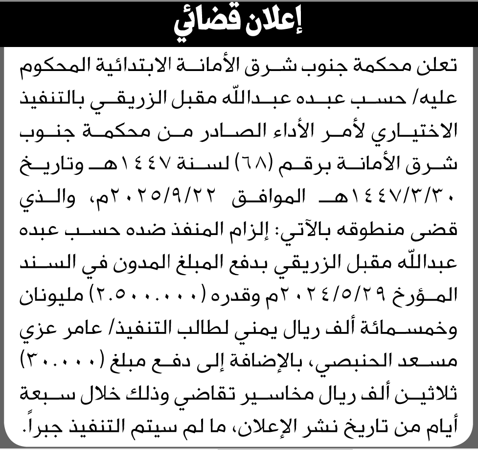 تعلن محكمة جنوب شرق الأمانة أن على المدعى عليه حسب الزريقي التنفيذ الاختياري للحكم إعلاناتمحاكم On ديسمبر 7, 2025 Share Share FacebookTwitterWhatsAppTelegramGoogle+البريد الإلكترونيPrint